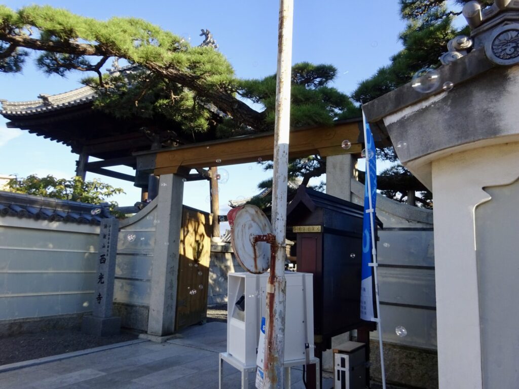 お寺の入り口に、シャボン玉の機械発見!