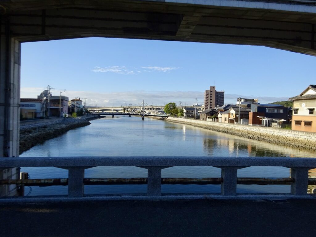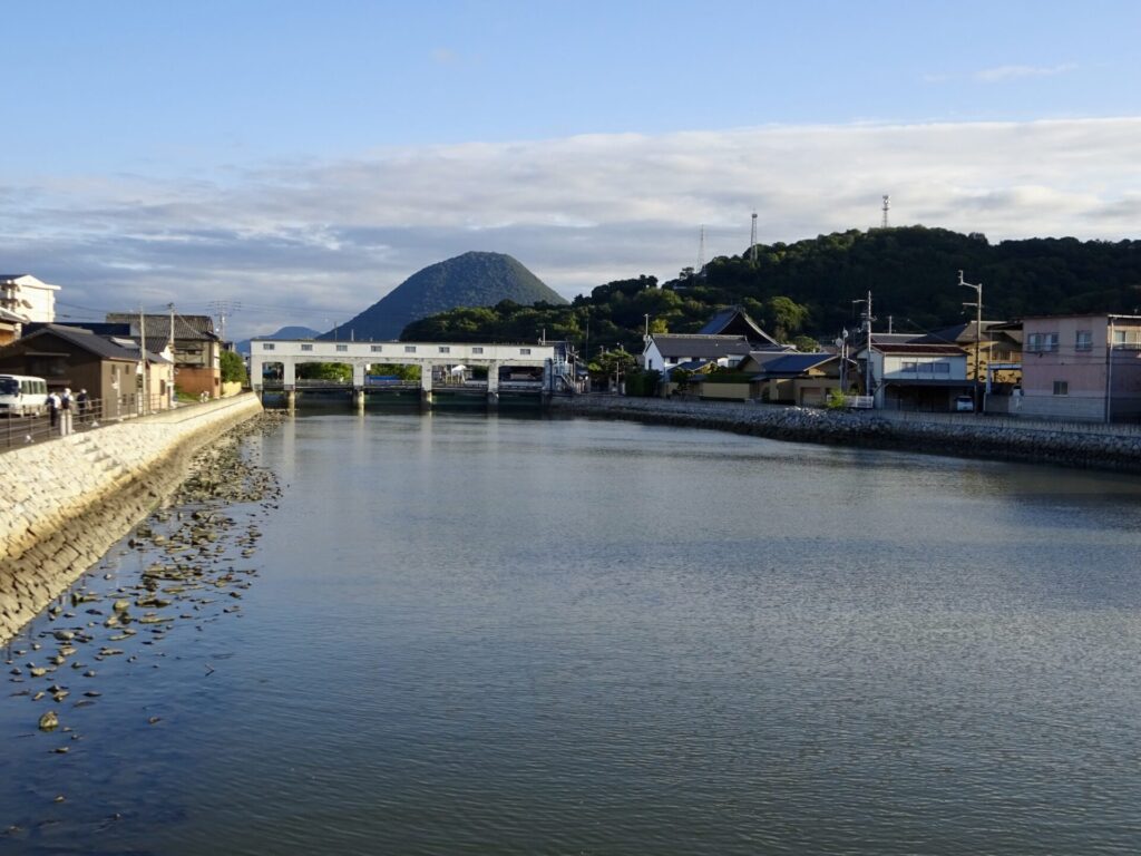 さっき渡った橋と、讃岐平野ならではの「おむすび山」が見えます。
