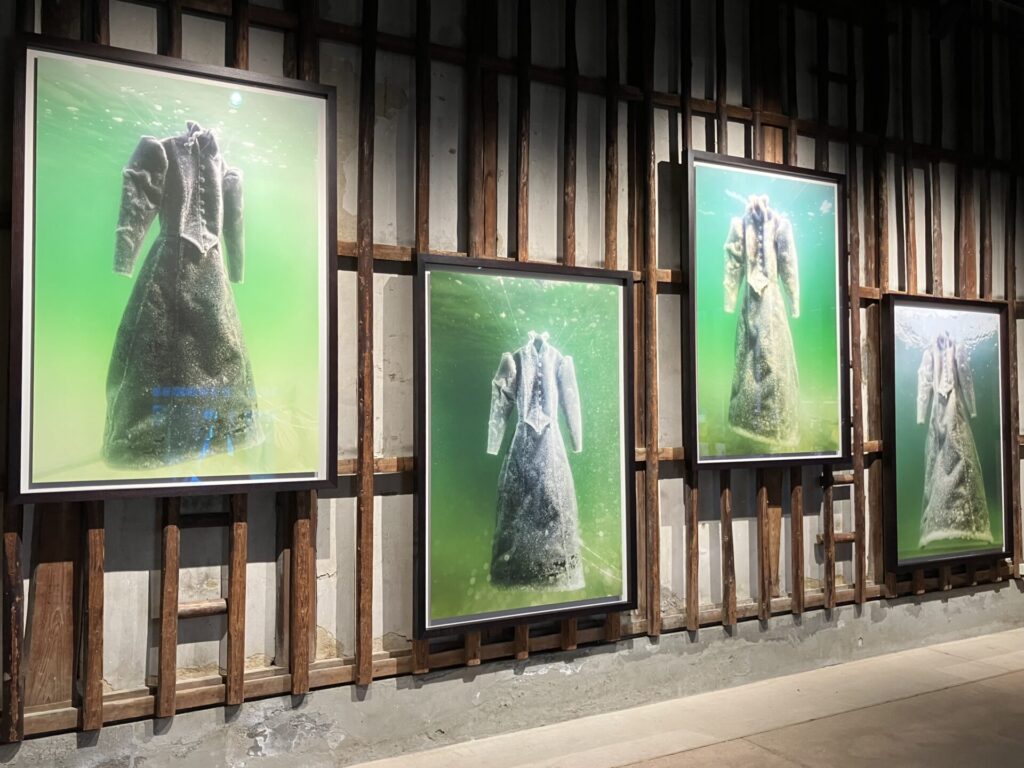 4枚の巨大パネルには、塩をまとったドレスの写真。